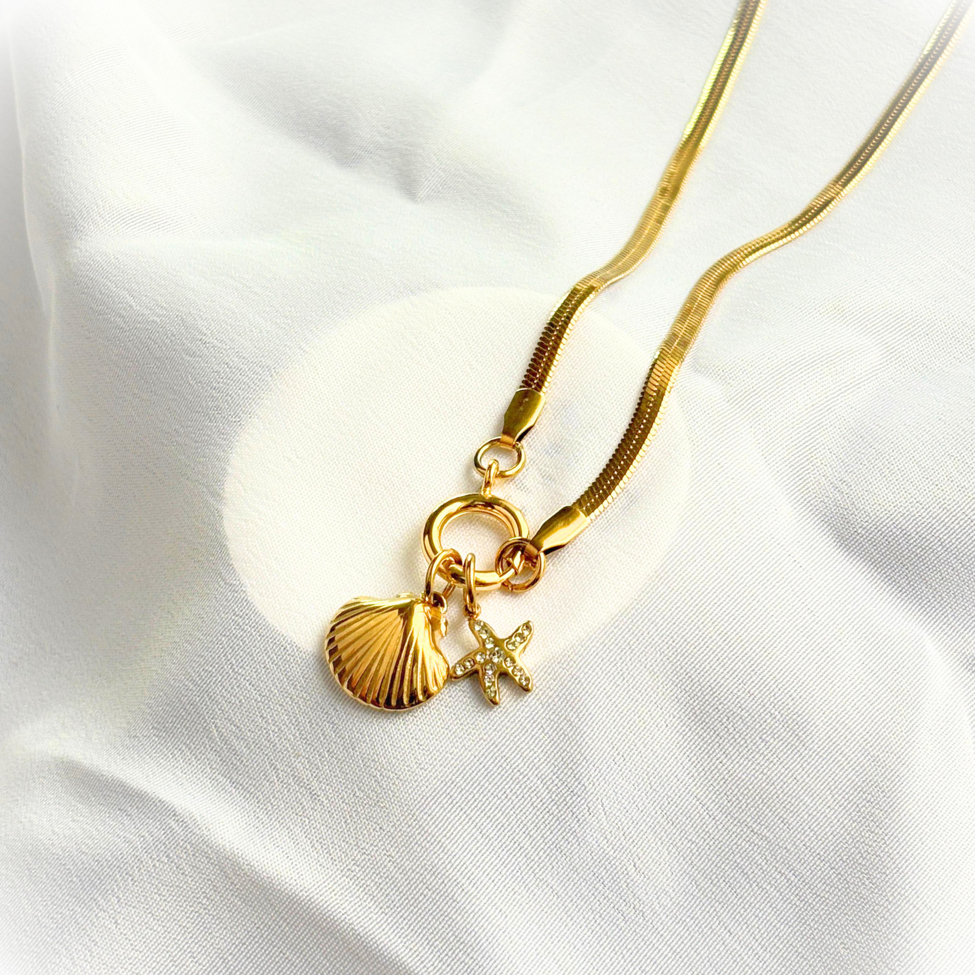 The Coralyn necklace captures the essence of coastal elegance with its delicate golden shell and sparkling starfish charm. Designed to evoke the tranquility of ocean getaways, this piece adds a subtle, sophisticated summer glow to any outfit. Perfectly balanced between playful and refined, it complements both casual looks and dressier ensembles, making it a versatile accessory for those who appreciate timeless, nature-inspired jewelry.