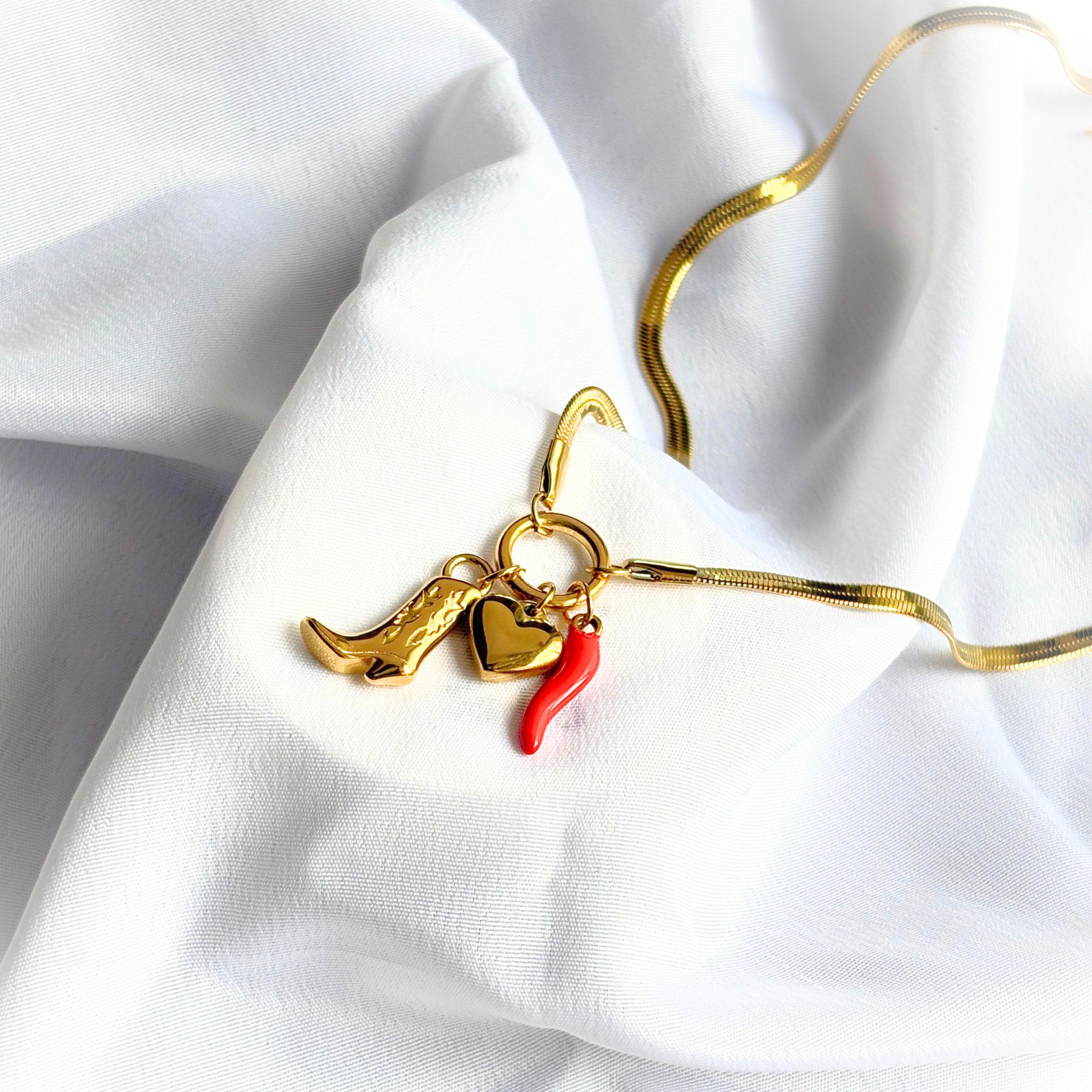 Bold and unapologetic, the Dolce Vita gold necklace combines playful elegance with meaningful symbolism. Featuring a striking stiletto boot, a radiant golden heart, and a traditional red coral talisman, it embodies love, passion, and fearless femininity. This necklace makes a confident statement, balancing style with protective charm for those who embrace both strength and grace.