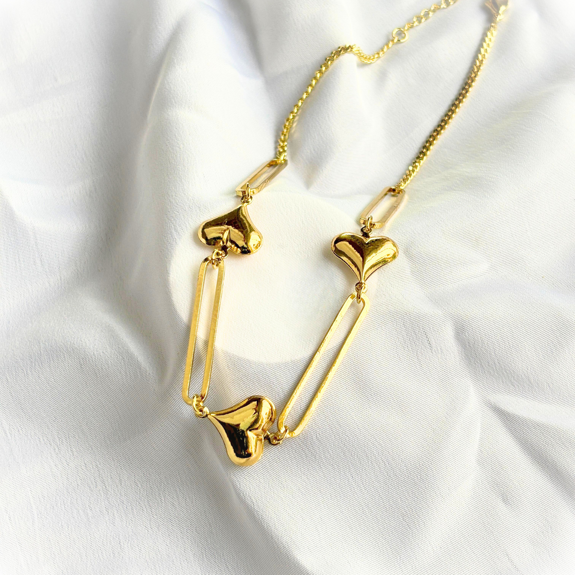 Luvea is a masterfully designed statement necklace blending sculptural golden hearts with sleek geometric bars. This piece offers a refined balance between bold sophistication and romantic allure, making it an ideal accessory for those seeking to elevate their style with contemporary artistry and playful elegance.