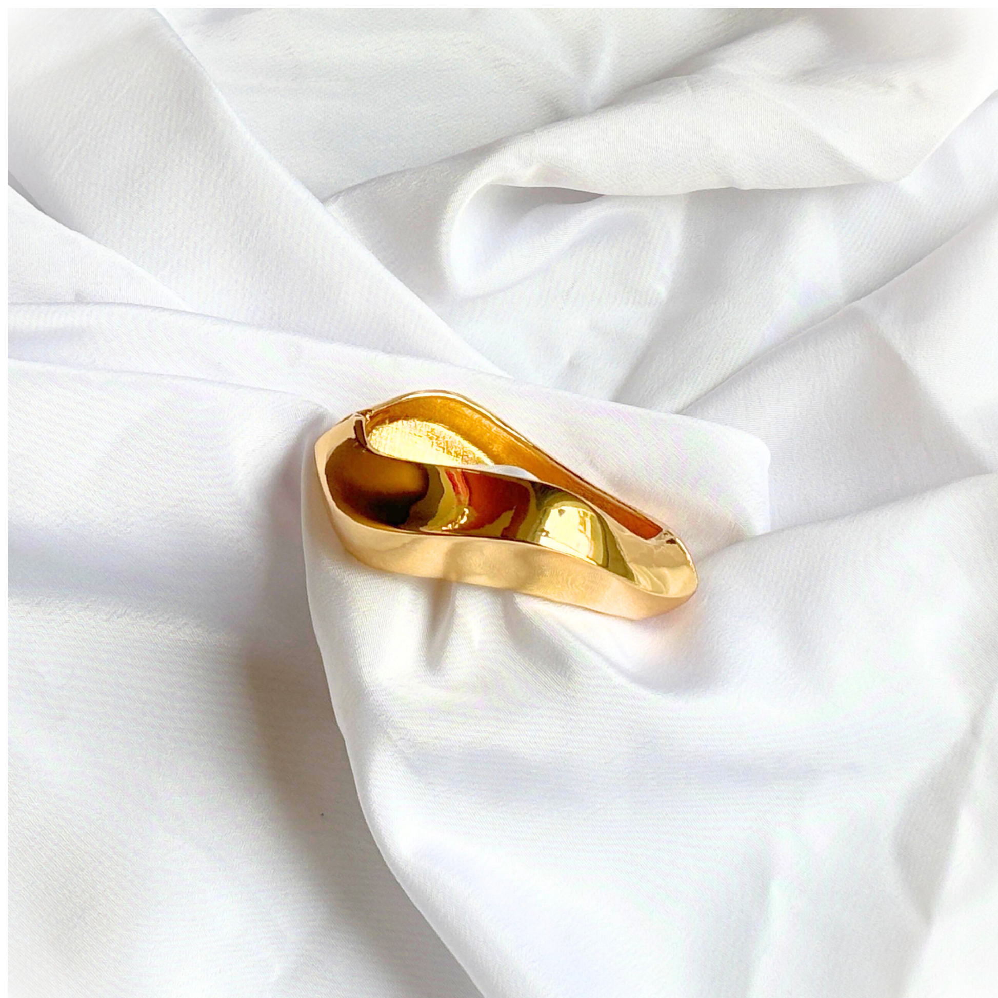 This playful bracelet shines with bold, gold-tone curves that melt into a fluid, artistic form. Its sculptural design turns heads while effortlessly adding a touch of everyday sophistication. Perfect for those who love to mix fun with timeless elegance.