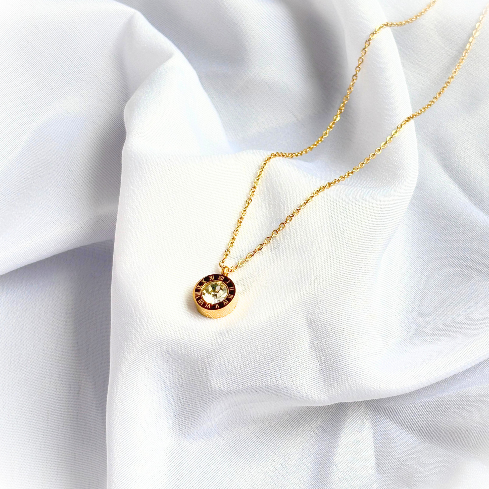 The Solara pendant necklace combines refined simplicity with enduring elegance. Featuring a radiant crystal set in a golden frame, this necklace is crafted to reflect light beautifully with every motion. Its versatile design allows it to be worn alone for a subtle statement or layered for added depth, making it an ideal accessory for transitioning seamlessly from day to evening wear.