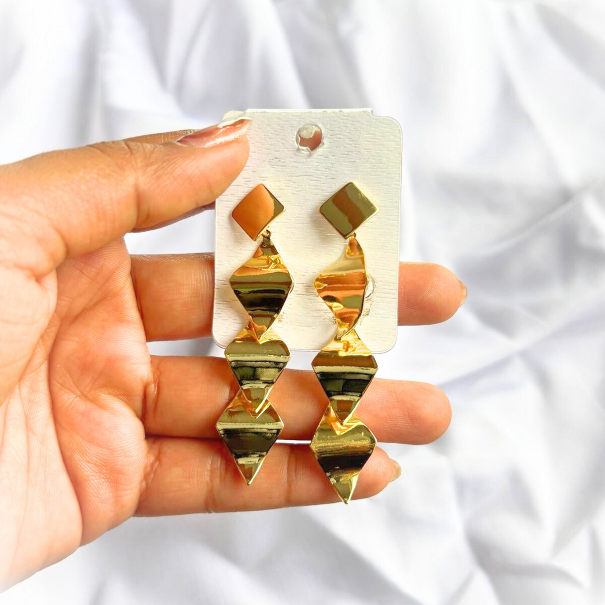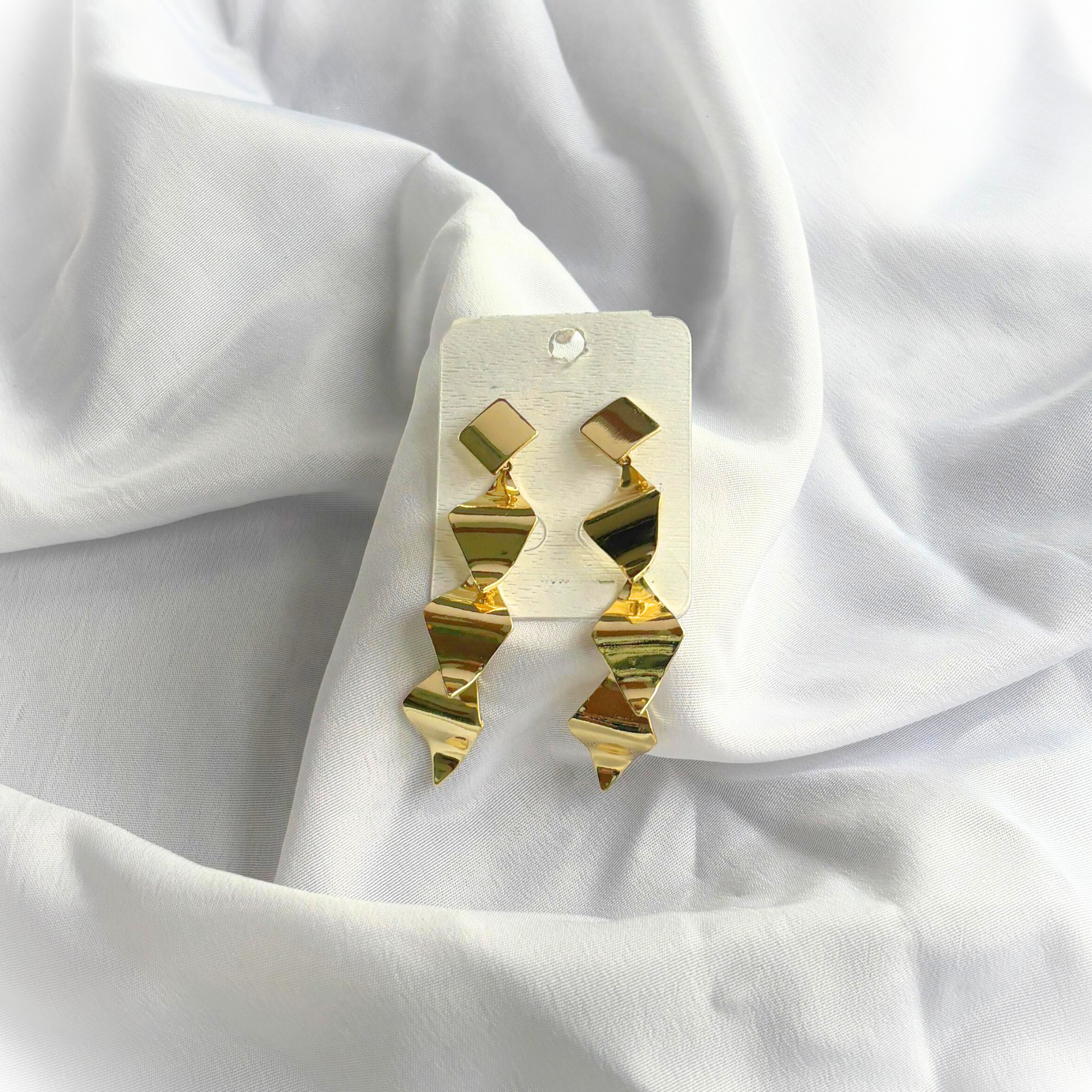 Turn heads with Zyra’s bold geometric layers in glossy gold-tone. Their sharp, angular design brings a fun edge to any outfit, effortlessly taking you from office chic to evening glam. Add a touch of modern drama to your look and let Zyra be your standout style companion.